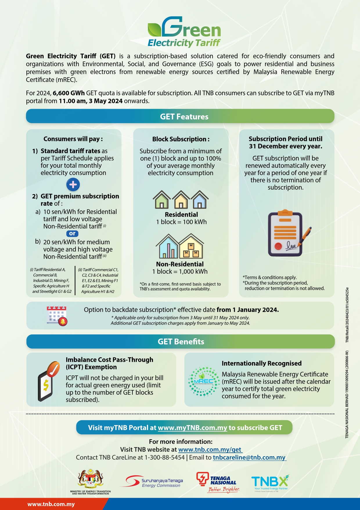 You can subscribe via the myTNB Portal at www.mytnb.com.my. The GET programme provides low-carbon electricity without needing rooftop solar panels. At the end of the year, you'll receive a certificate (mREC) confirming your contribution to renewable energy.